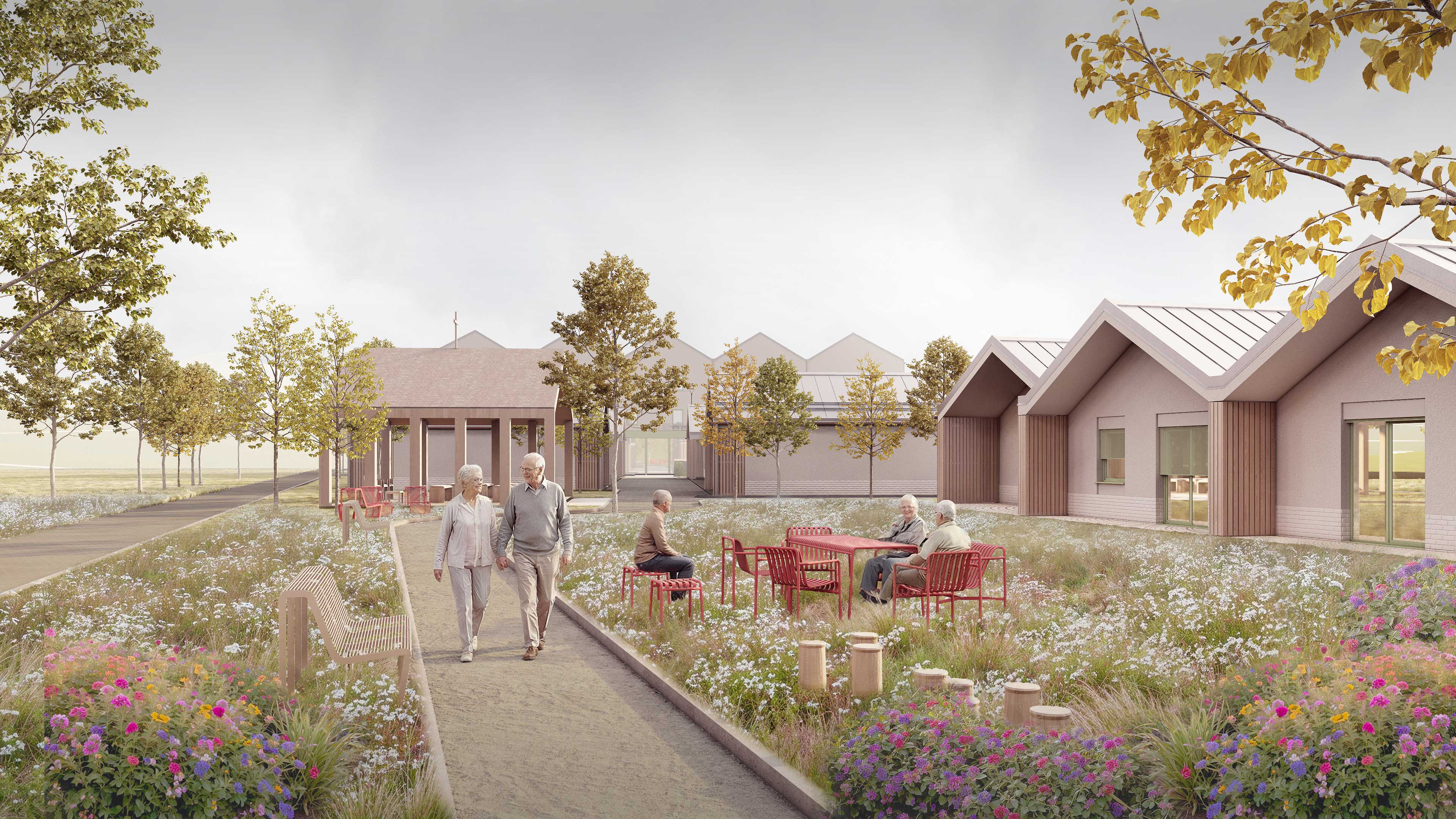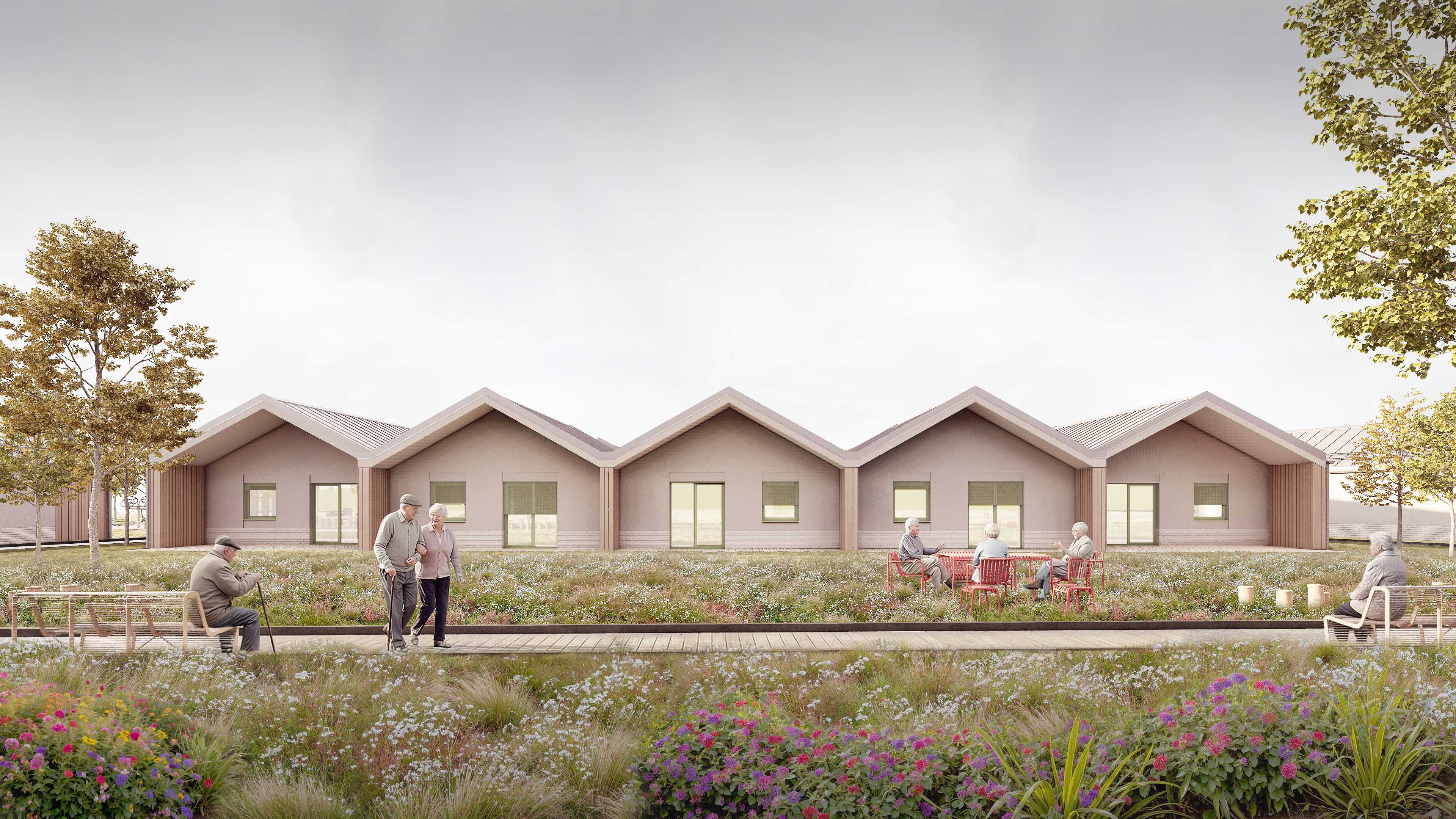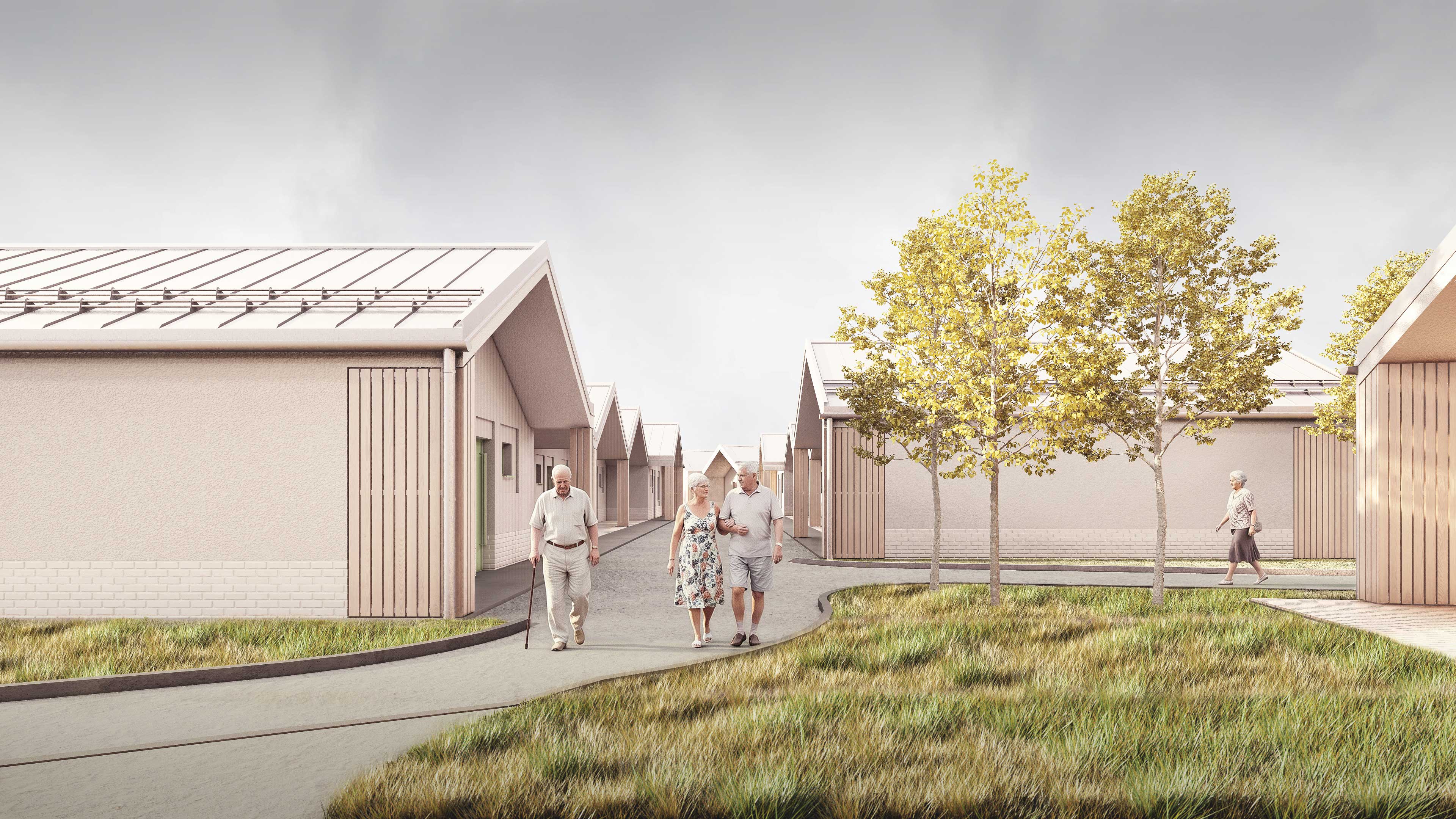 Na pozemku sa nachádza 35 samostatných dvojizbových plne vybavených obytných jednotiek. Každá s celkovou úžitkovou plochou 49,71 m2 . Tie slúžia pre potreby centra ako kapacita pre aktívnych seniorov. Jednotky sú spojené do zrastlice 5-tich domov a jej odzrkadlením vzniká akýsi klaster 10-tich domov s malým nádvorím. Celkovo je na území situovaných 3,5 klastra, ktorý každý z nich má svoje farebné signifikantné označenie. Obytné jednotky sú zasadené do prostredia, ktoré je dotvorené záhradnou úpravou s rôznymi exteriérovými atrakciami a parkovým mobiliárom. Každý klaster je prístupný pešou a automobilovou areálovou komunikáciu pre zásobovanie a prístup sanitky, resp. požiarneho vozidla. Stacionárne parkovacie plochy sú zabezpečené pred centrálnou budovou. Komplex ma zabezpečený servis, záhradný servis a celodennú ostrahu. Komplex bude oplotený. Konštrukčný systém pri všetkých stavebných objektoch je z keramického murovacieho materiálu. Strešné roviny sedlové sú konštruované z drevených klincovaných väzníkov. Fasáda objektov je kontaktná s možnosťou stvárnenia kompozície viacerých druhov štruktúry a zrnitosti. Parter centrálneho objektu ako aj sokel malého objektu samostatnej jednotky je navrhnutý ako keramický obklad typu klinker. Na fasáde je tiež použité termodrevo a decentný doplnok k materiálovej atraktivite architektúry a prostredia. Farebné riešenie fasád neutrálnych tlmených farieb vhodne dopĺňajú pastelovejšie farby hliníkových okenných rámov. Rytmus sedlových tvarov striech je hlavným signifikantom vonkajšieho vzhľadu architektúry komplexu. Objekty sú nepodpivničené. Komplex zariadenia pre seniorov je napojený na všetky inžinierske siete. Dažďová voda sa bude likvidovať na pozemku cez vsakovacie bloky. Retenčná nádrž bude slúžiť aj ako zásobník vody na polievanie. V návrhu uvažujeme s dažďovými jazierkami a inými vodo-zádržnými opatreniami. Návrh predbežne uvažuje s inštáláciou FVE Panelov na strechách. V centrálnom objekte je navrhnutá centrálna rekuperácia vzduchu a v malých jednotkách sa uvažuje s použitím malých lokálnych rekuperačných jednotiek. Zdroj tepla je navrhnutý ako plynové kotle umiestnené centrálne v hlavnej budove a kolektorom rozvedené do záhradných klastrov. Vo všetkých obytných a administratívnych miestnostiach je podlahové vykurovanie, zázemie a technické miestnosti sú doplnené s konvenčným vykurovaním. Na všetkých oknách sú navrhnuté screenové rolety. Objekty sú vybavené štandardami prislúchajúcimi DSS, resp. typológiou zdravotníckych zariadení.