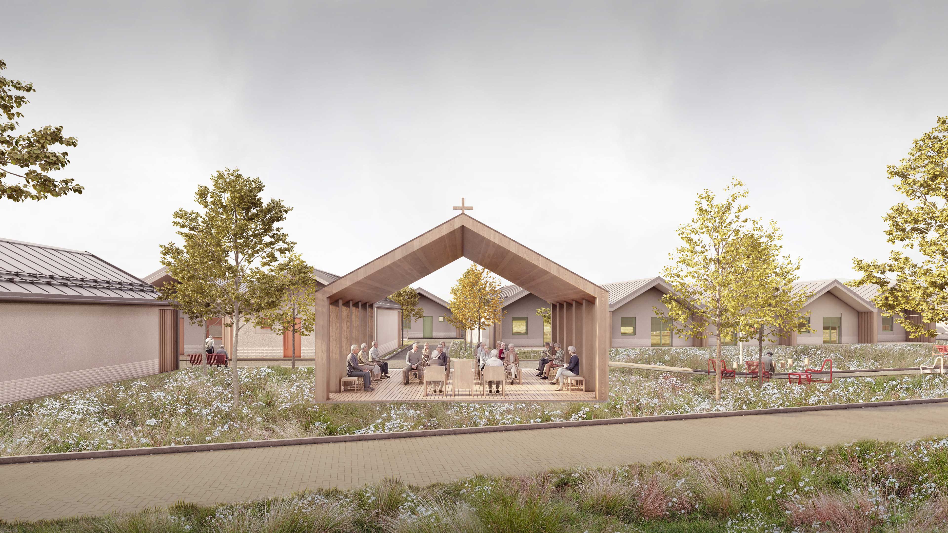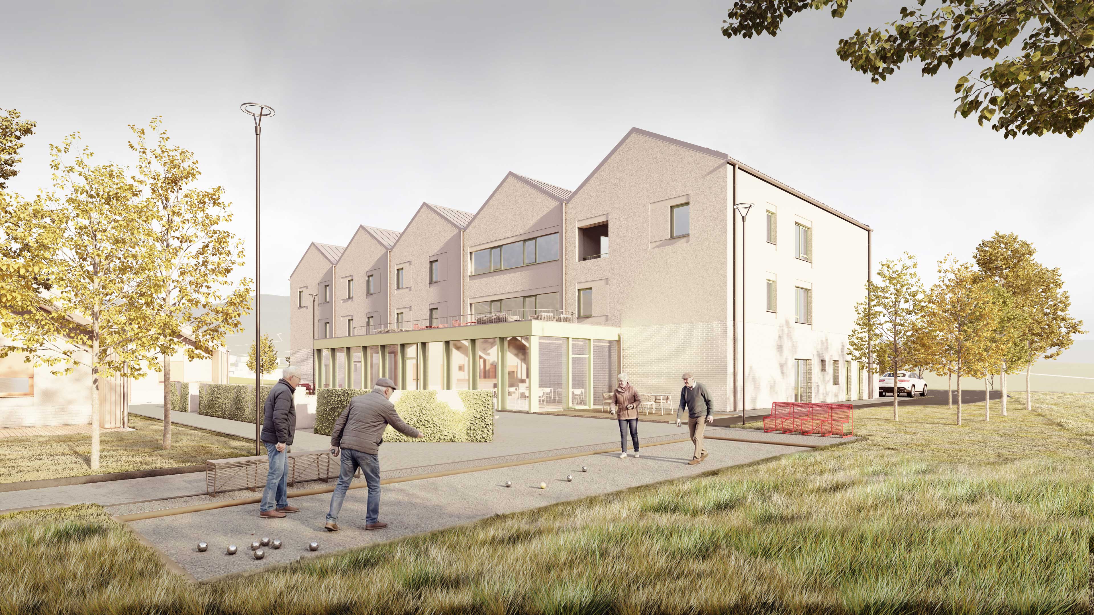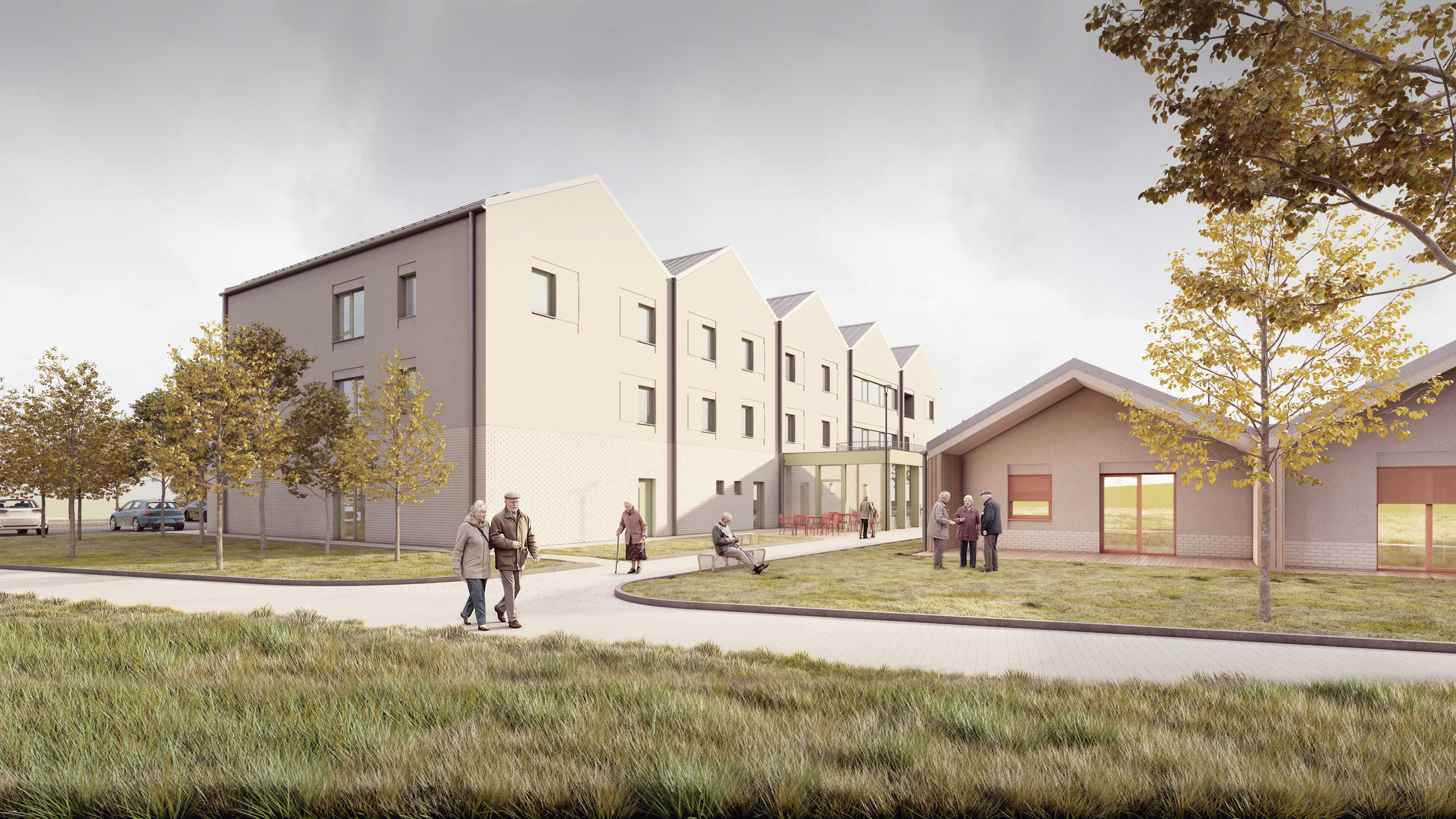Na pozemku sa nachádza 35 samostatných dvojizbových plne vybavených obytných jednotiek. Každá s celkovou úžitkovou plochou 49,71 m2 . Tie slúžia pre potreby centra ako kapacita pre aktívnych seniorov. Jednotky sú spojené do zrastlice 5-tich domov a jej odzrkadlením vzniká akýsi klaster 10-tich domov s malým nádvorím. Celkovo je na území situovaných 3,5 klastra, ktorý každý z nich má svoje farebné signifikantné označenie. Obytné jednotky sú zasadené do prostredia, ktoré je dotvorené záhradnou úpravou s rôznymi exteriérovými atrakciami a parkovým mobiliárom. Každý klaster je prístupný pešou a automobilovou areálovou komunikáciu pre zásobovanie a prístup sanitky, resp. požiarneho vozidla. Stacionárne parkovacie plochy sú zabezpečené pred centrálnou budovou. Komplex ma zabezpečený servis, záhradný servis a celodennú ostrahu. Komplex bude oplotený. Konštrukčný systém pri všetkých stavebných objektoch je z keramického murovacieho materiálu. Strešné roviny sedlové sú konštruované z drevených klincovaných väzníkov. Fasáda objektov je kontaktná s možnosťou stvárnenia kompozície viacerých druhov štruktúry a zrnitosti. Parter centrálneho objektu ako aj sokel malého objektu samostatnej jednotky je navrhnutý ako keramický obklad typu klinker. Na fasáde je tiež použité termodrevo a decentný doplnok k materiálovej atraktivite architektúry a prostredia. Farebné riešenie fasád neutrálnych tlmených farieb vhodne dopĺňajú pastelovejšie farby hliníkových okenných rámov. Rytmus sedlových tvarov striech je hlavným signifikantom vonkajšieho vzhľadu architektúry komplexu. Objekty sú nepodpivničené. Komplex zariadenia pre seniorov je napojený na všetky inžinierske siete. Dažďová voda sa bude likvidovať na pozemku cez vsakovacie bloky. Retenčná nádrž bude slúžiť aj ako zásobník vody na polievanie. V návrhu uvažujeme s dažďovými jazierkami a inými vodo-zádržnými opatreniami. Návrh predbežne uvažuje s inštáláciou FVE Panelov na strechách. V centrálnom objekte je navrhnutá centrálna rekuperácia vzduchu a v malých jednotkách sa uvažuje s použitím malých lokálnych rekuperačných jednotiek. Zdroj tepla je navrhnutý ako plynové kotle umiestnené centrálne v hlavnej budove a kolektorom rozvedené do záhradných klastrov. Vo všetkých obytných a administratívnych miestnostiach je podlahové vykurovanie, zázemie a technické miestnosti sú doplnené s konvenčným vykurovaním. Na všetkých oknách sú navrhnuté screenové rolety. Objekty sú vybavené štandardami prislúchajúcimi DSS, resp. typológiou zdravotníckych zariadení.